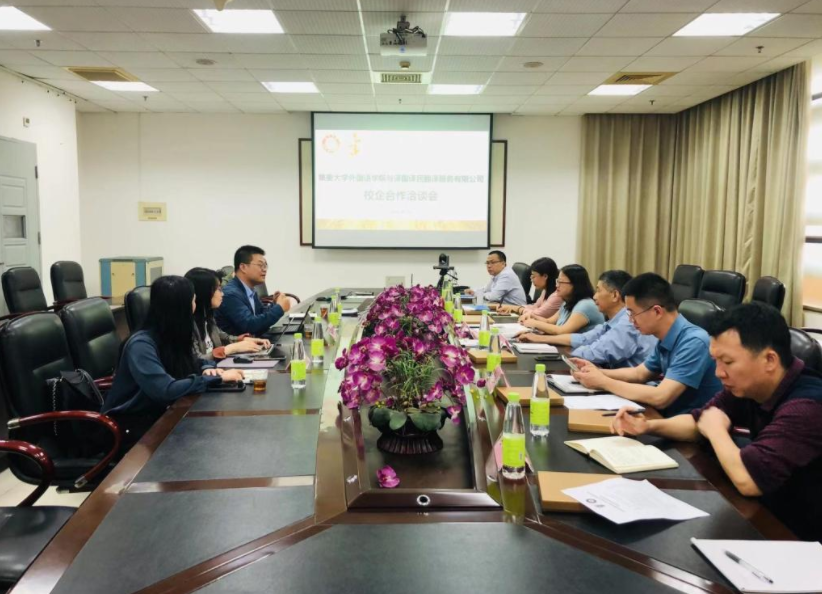 学院与企业于2018年起签约共建实习基地。几年来,双方在学生实习、公益讲座、暑期实践、教师培训等多方面进行了富有成效的合作。首先,林世宋向学院介绍了近年来企业的发展现状。企业在北京、上海、武汉、西安等多个城市与包括上海外国语大学、广东外语外贸大学、武汉科技大学等多所高校开展实质性校企合作项目。内容包括学科建设、实验室建设、双师型师资培训、课程建设、实习实践等项目。随后,学院领导及系部主任与林世宋一行展开深入对谈,对今后可能合作的领域,如翻译教学改革、精品课程建设、横向课题、翻译团队建设、双师型师资培养等方面进行了初步探讨。此次洽谈为学院翻译本科及硕士项目建设进一步引进优质资源打下良好的基础。会后,宾主双方亲切合影,共同庆祝携手发展和友好合作。