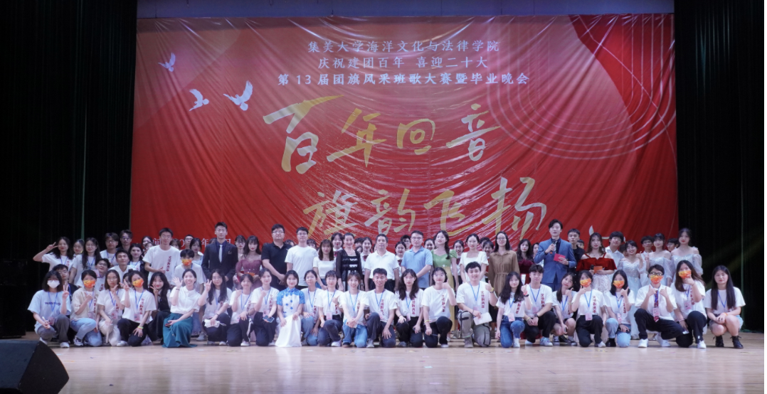 为献礼中国共产主义青年团成立一百周年,喜迎党的二十大胜利召开,展现海洋文化与法律学院学子们的青春活力,5月29日晚,学院在古龙大礼堂成功举办第13届“百年回音 旗韵飞扬”团旗风采班歌大赛暨毕业生欢送晚会。