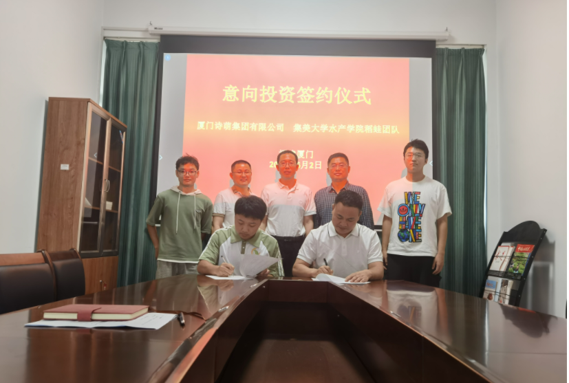 6月2日下午,水产学院“稻蛙丰年”团队融资签约仪式在水产学院会议室举行。学院院长张春晓、副书记黄庆胜、厦门诗萌集团有限公司董事长魏明森、福建屿南名胜旅游集团总经理谢茂宾、学院副教授王玲等领导嘉宾及水产学院“稻蛙丰年”项目团队成员参加会议。会议由张春晓主持。