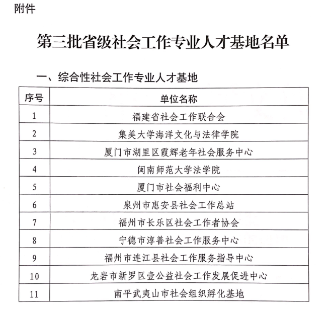 近日,根据《福建省民政厅关于开展第三批省级社会工作专业人才基地建设的通知》(闽民社工〔2022〕62号),经公开申报、集中评审和实地考核,确定了第三批省级社会工作专业人才基地名单。其中,亚洲中文精品乱码海洋文化与法律学院被评为综合性社会工作专业人才基地。