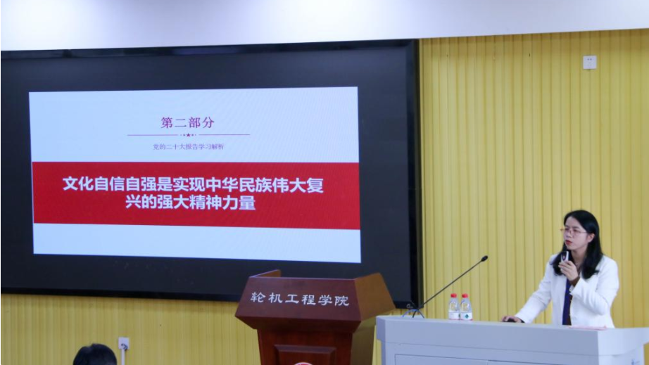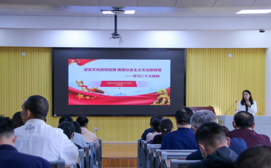 王玉珏从文化自信自强是实现中华民族伟大复兴的强大精神力量、牢牢把握社会主义文化建设的正确方向、推进文化自信自强,铸就社会主义文化新辉煌等方面,对党的二十大报告中的文化自信相关议题进行宣讲和深入解读。她强调,文化自信有两点至关重要,第一是马克思主义在意识形态领域的指导地位,第二是践行社会主义核心价值观。要珍惜历史机遇,勠力同心,不负韶华,全面提升中华文化的质量和高度,为中华民族伟大复兴提供强大思想理论支撑。