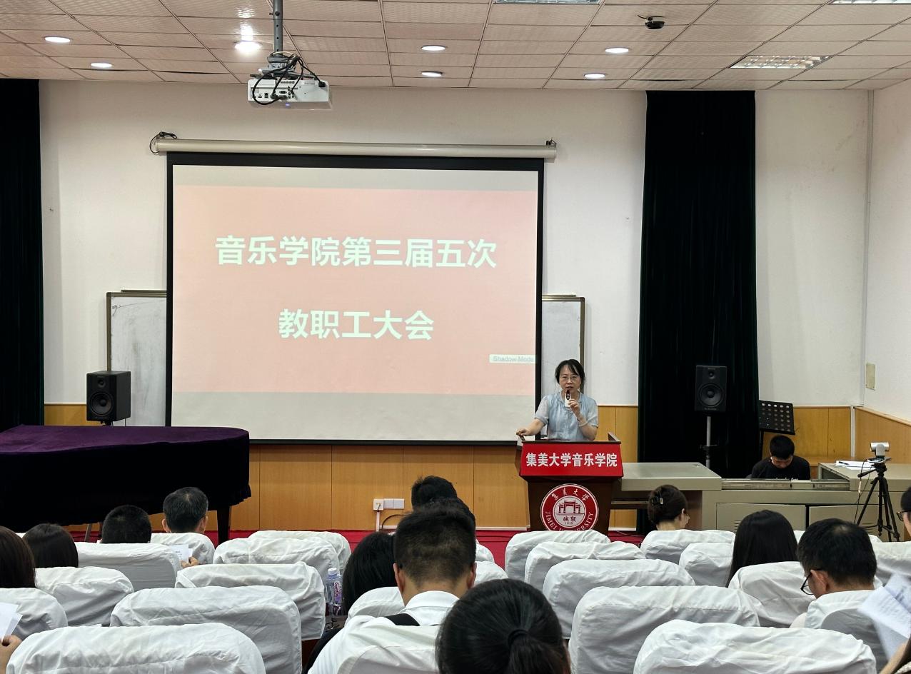 9月20日,音乐学院召开第三届五次教职工大会,会议由院党委副书记、部门工会主席洪妍妮主持。