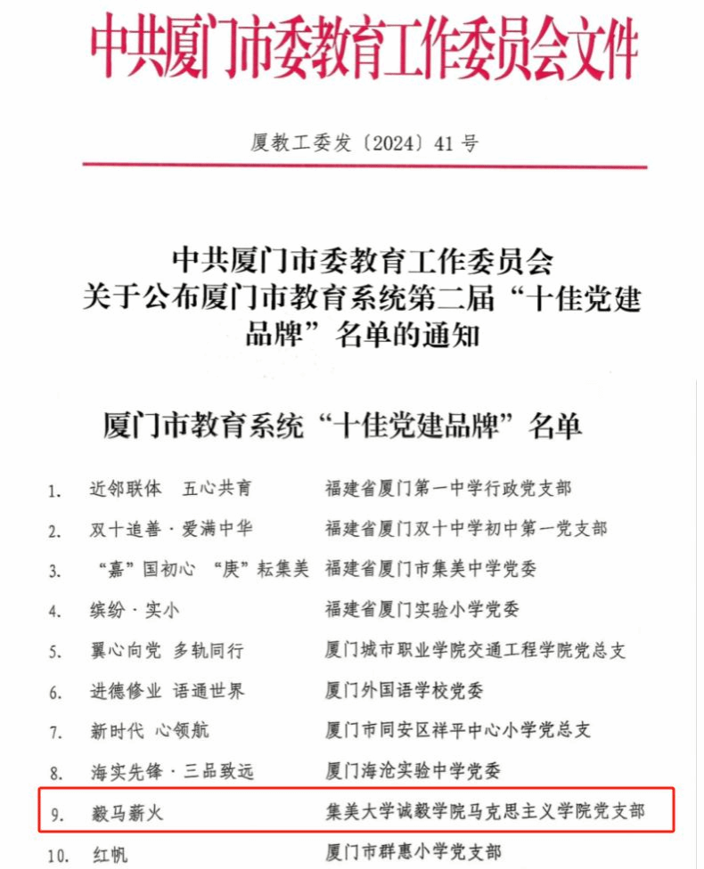 近日,厦门市教育系统第二届“十佳党建品牌”公布,诚毅学院马克思主义党支部 “毅马薪火”党建品牌获评“十佳党建品牌”。
